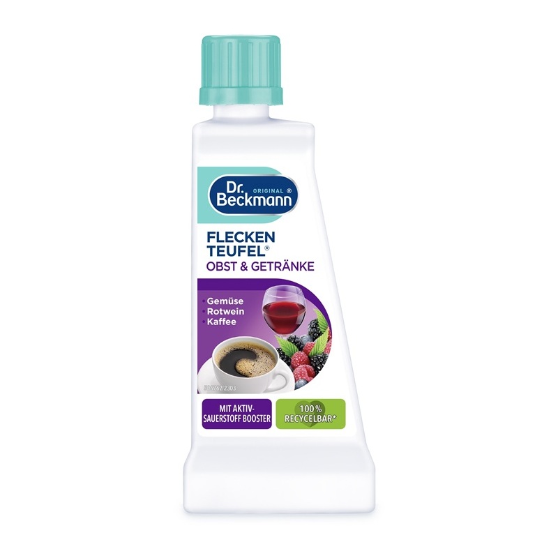 Dr. Beckmann Fleckenteufel Obst & Getränke Inhalt: 50 g Mit Aktiv-Sauerstoff Booster Entfernt sowohl Rotwein-, Kaffee-, Tee-, Obst- und Gemüseflecken als auch Saft-, Kakao-, Schimmel- und Stockflecken Geeignet für waschbare und nicht waschbare Textilien Schont Farben und Gewebe